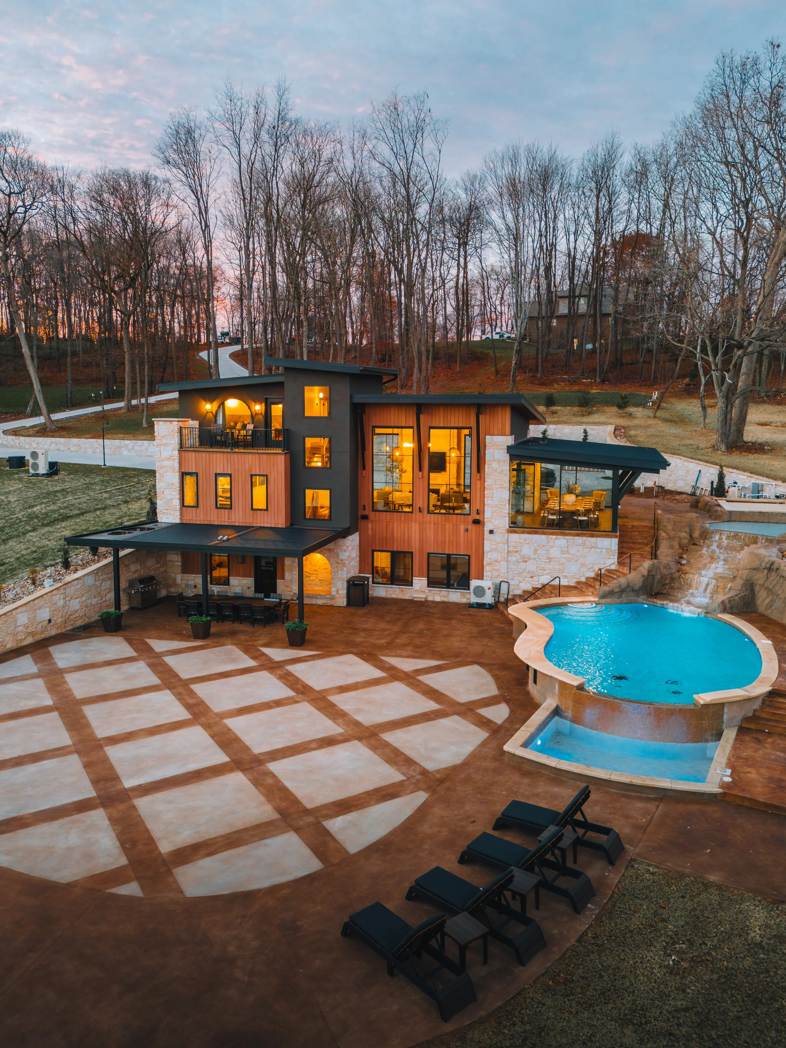 Nestled in the picturesque rolling hills of Sugarcreek, OH, this expansive interior design project beautifully blends the rustic charm of Colorado ski-lodge architecture with warm, inviting feminine elements. The dining room, a stunning focal point, features three sides of glass walls that offer breathtaking views of an impressive boulder-carved waterfall pool. Elegant marquetry parquet flooring flows gracefully throughout the main level, seamlessly leading the eye toward the expansive 14-foot windows that frame the enchanting back patio.